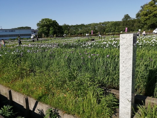 無料駐車場から見た花菖蒲園。門柱には「曽根城公園 花菖蒲池」と書いてあるな。公式HPには「花菖蒲園」と書いてあったが、このくらいの表記揺れはあるあるである。