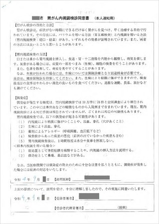 検診内容は「大腸がん」「肺がん」「前立腺がん」「胃がん」。大腸がんは事前の検便、肺がんはX線写真、前立腺がんは採血、そして胃がんは胃カメラ。やることは3年前と変わらなかった。