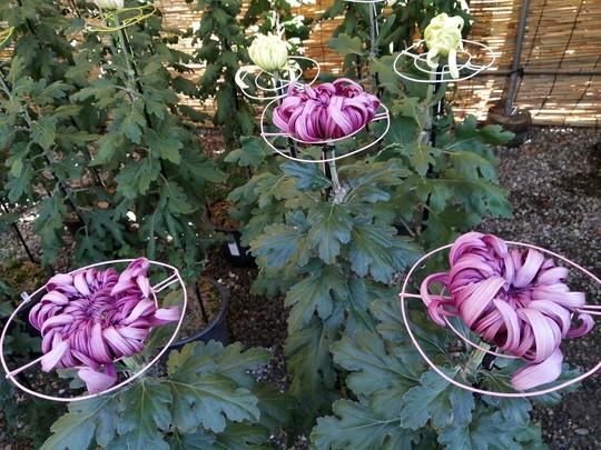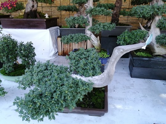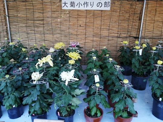 菊展のほうを。「山菊自営花壇の部」。盆栽との組み合わせだろうか。