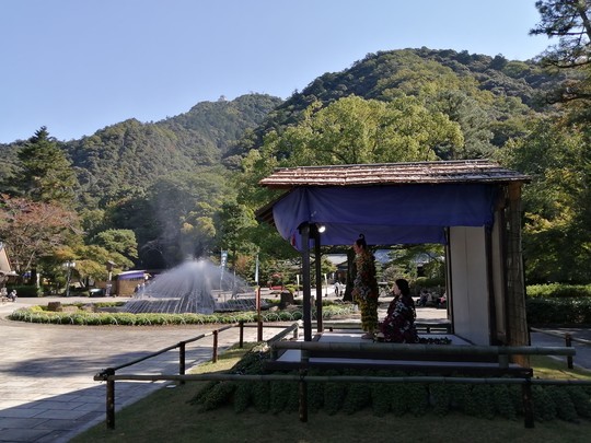 噴水左奥に見える小屋のようなものが、菊人形の展示ブースだった。