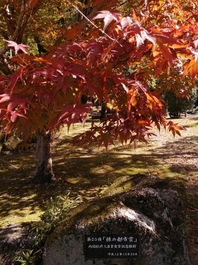 岐阜公園は全体として紅葉にはまだ早いが、ごらんのように一部鮮やかに色づいていた木もあった。カエデかな?