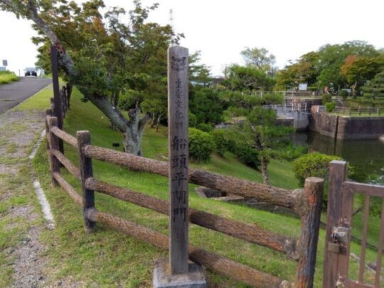 木曽川側の水門扉のあたりに移動しようとしたら「重要文化財 船頭平閘門」と書かれた木柱があった。