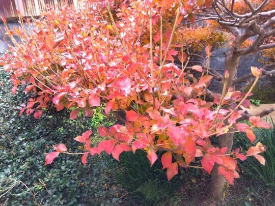 関連性は薄いけど、このさい実家ネタをもう一件。庭のドウダンツツジが紅葉のまっ盛りとのことだったので、スマホ写真を撮った。