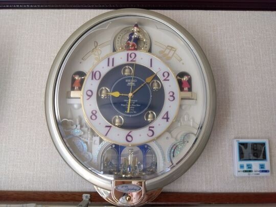持ち帰った仕掛け時計。隣の温湿度計が比較対象になってくれている。ギリギリ掛けられるくらいの大きさだった。もし掛けられなかったら、どうすればよかったんだろう?