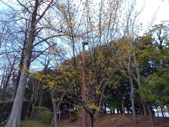水路ぞいに可憐な黄色い花を咲かせるロウバイがあった。