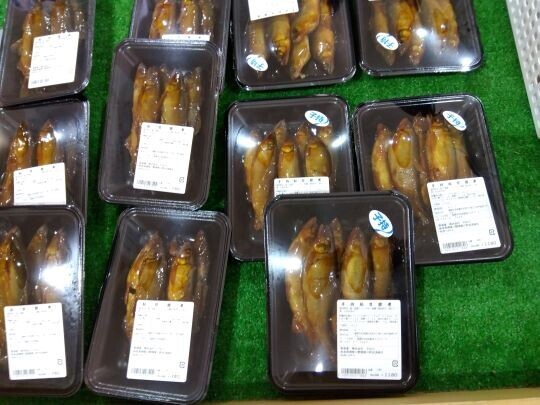しいたけ の隣に、アユ甘露煮が置いてあった。真空パック入りはいつも置いてあるけど、こんなトレイ入りをここで見るのは珍しい。