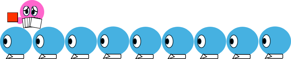 n人のプレイヤーが、自分の前にいるプレイヤーの帽子の色しか見えないように並ぶ。かぶせ手が赤い帽子1個と白い帽子nマイナス1個のうち、どれかを彼らにかぶせる。