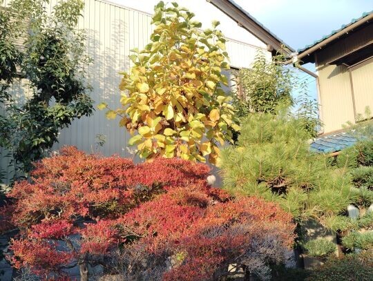 左手前の紅葉はドウダンツツジ、中央奥の黄葉はモクレン、その右下の常緑樹はマツである。