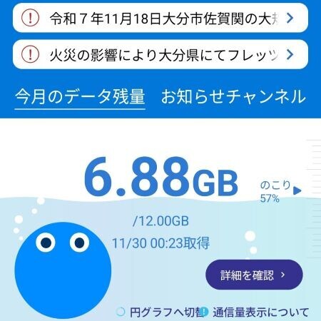 タップすると詳細データが表示されるが、この表示が有効数字の桁数いちばん多いな。6-5.116=0.884(GB) が今月の切り捨てだ。